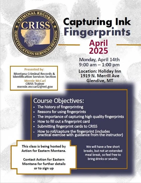 Action for Eastern Montana Head Start is holding a training to certify individuals in how to roll fingerprints for State background checks. There is no cost for this training. Please contact us to put your name on the training roster.